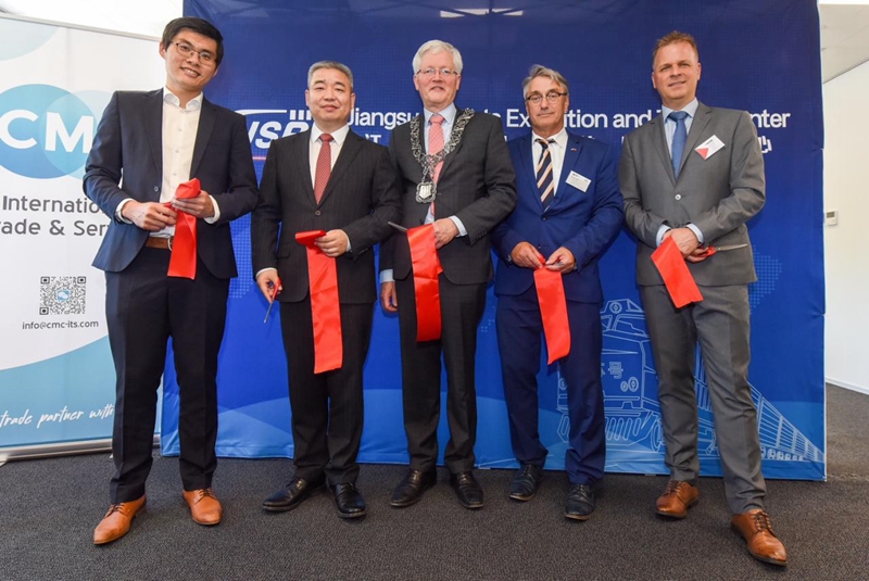 中国驻荷兰大使馆经商参赞张国胜、荷兰蒂尔堡市市长Theo Weterings、荷兰北布拉邦省经济发展署副署长Eelko Brinkhoff等共同为江苏商品展销中心剪彩