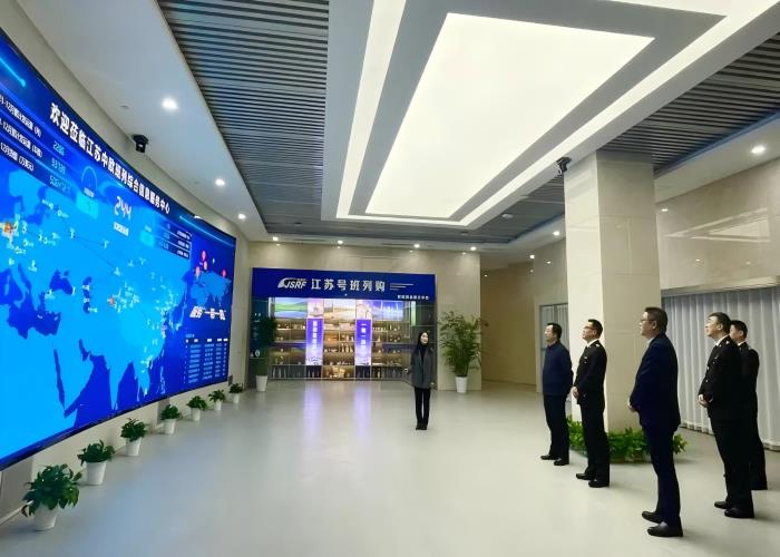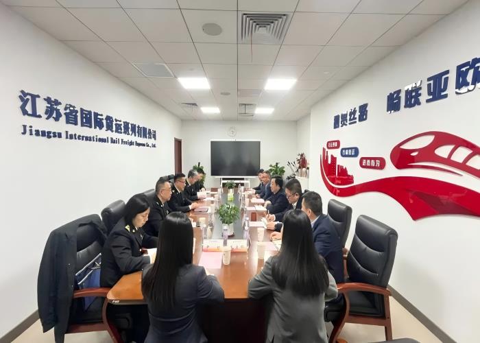 李明对谢国柱一行的到来表示欢迎,并对南京海关长期以来给予苏豪控股集团以及省班列公司的关心支持表示感谢。他表示,当前,苏豪控股集团正围绕构建安全畅通高效的现代物流体系,着力提升江苏中欧班列运行质效,推动省级物流平台组建等重点任务,助力江苏加快构建“陆海内外联动、东西双向互济”的开放格局。希望南京海关继续关心支持苏豪控股集团和江苏班列发展,在数据信息共享、监管政策等方面给予更多指导和帮助。谢国柱对苏豪控股集团改革发展成果及江苏班列近年来统筹发展成效给予肯定。他表示,南京海关与苏豪控股集团、省班列公司都有着良好的沟通和合作基础,本次调研旨在更好了解江苏班列发展动态,发挥海关职能作用,促进同向发力,更好服务融入共建“一带一路”高质量发展。南京海关将以此次调研为契机,继续为苏豪控股集团贸易主业发展提供政策服务支撑,启动支持江苏中欧班列高质量发展工作专班相关工作,列出调研清单。希望双方进一步加强信息互通,构建日常协调沟通机制,共同推动江苏中欧班列高质量发展。陈玉卯详细介绍了江苏班列2024年主要工作完成情况和今年重点任务目标。与会人员就连徐集结中心建设、推进跨境电商、“铁路快速通关”等业务发展中遇到的实际问题、难点进行交流。南京海关口岸监管处相关负责同志现场厘清问题、提供政策解答,并表示将继续做好服务,促进江苏班列健康可持续发展。会前,谢国柱一行还参观了江苏中欧班列综合信息服务中心。