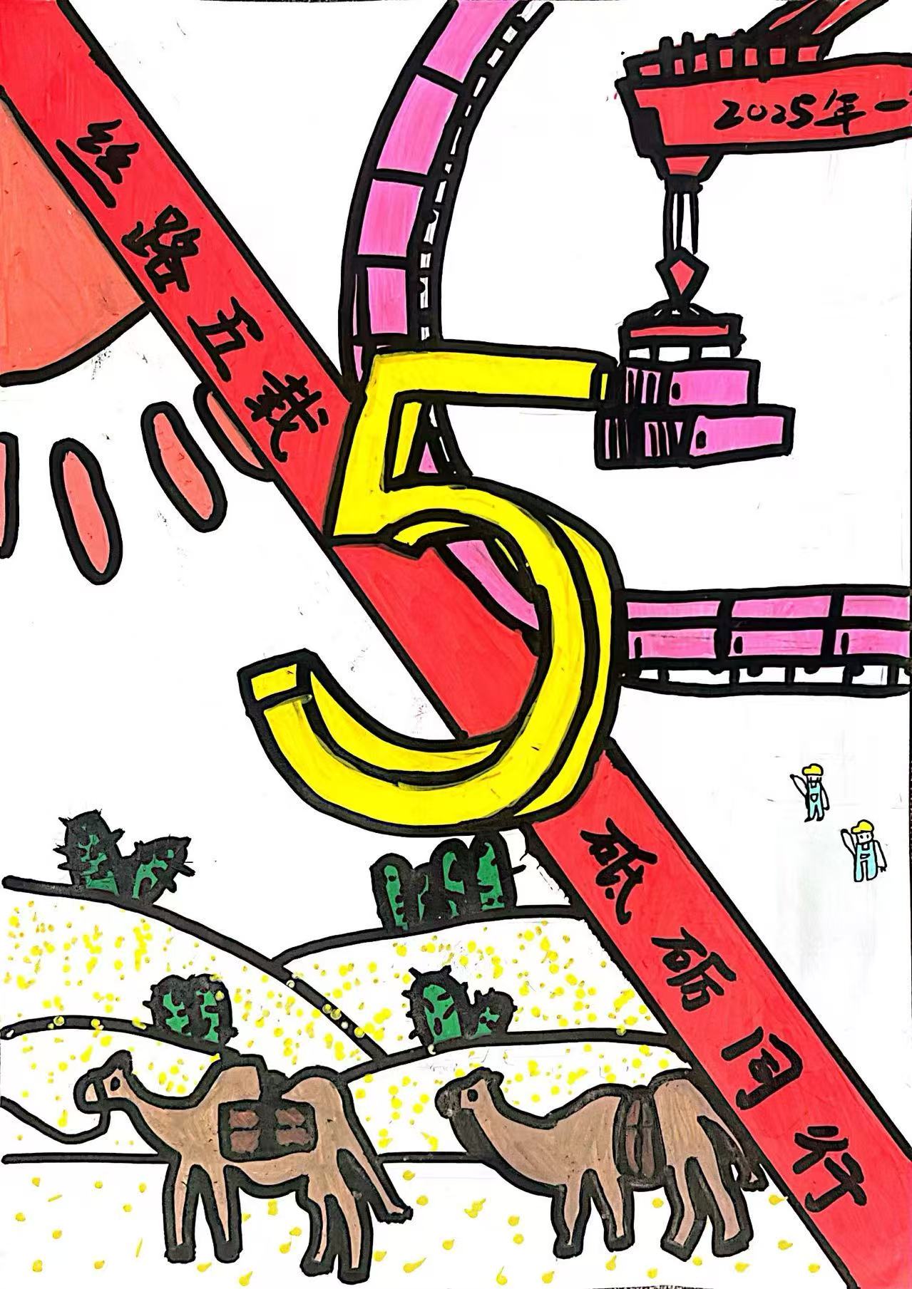 画面中的起重机象征着在 “一带一路” 倡议下基础设施建设方面的成果与发展;骆驼则代表着古代丝绸之路,寓意古今丝路的传承与延续;文字和数字突出了时间节点,表达对 “一带一路” 倡议五年来所取得成就的回顾与庆贺,同时也传递出各方在这五年里砥砺奋进、携手同行的积极精神。