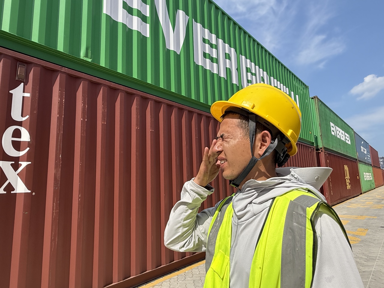 8月夏日高温,一线门吊指挥员用汗水筑牢指挥防线。