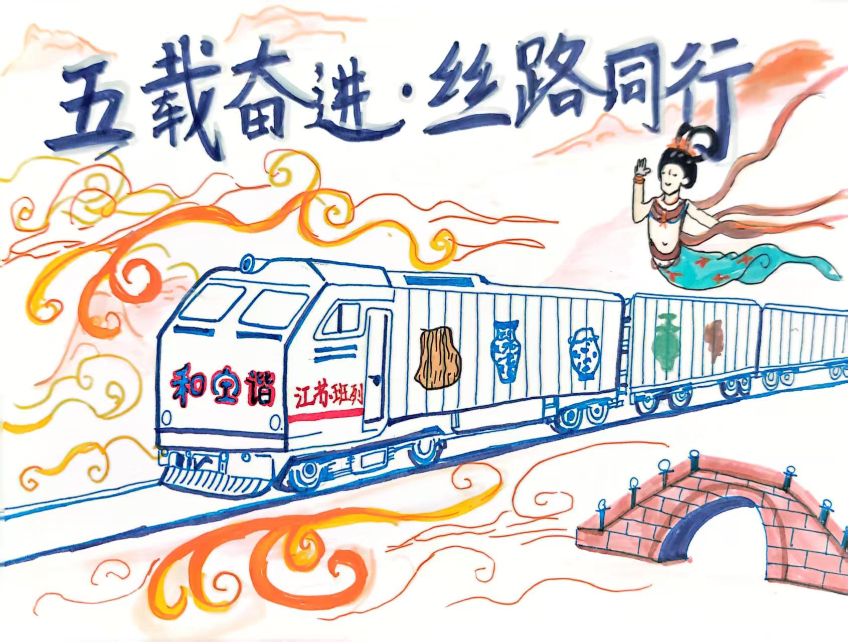 江苏省班列公司成立至今五载,江苏中欧班列从长江之滨的南京启程,满载丝绸、瓷器、玉器等华夏文明符号穿行古今。列车驶过水墨晕染的江南石桥,辉映着现代都市的天际线。敦煌飞天在云端起舞,见证这列"钢铁驼队"以蓝、白、红的奋进之姿,在"五载奋进·丝路同行"的磅礴笔势下,续写新时代陆上丝绸之路的江苏篇章。